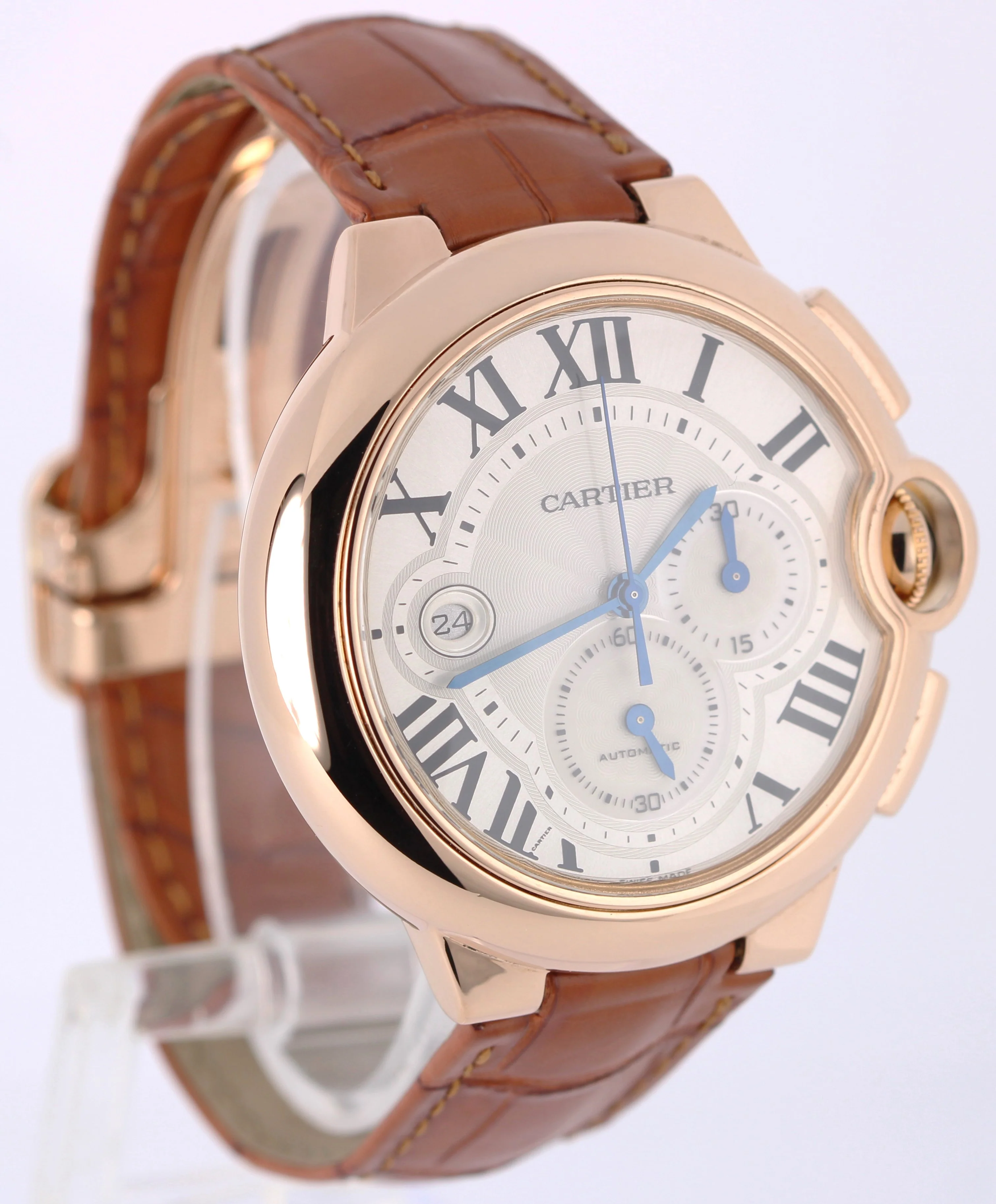 Cartier Ballon Bleu XL Chrono Date 18k Rose Gold Silver 44mm 3107 Leather Watch