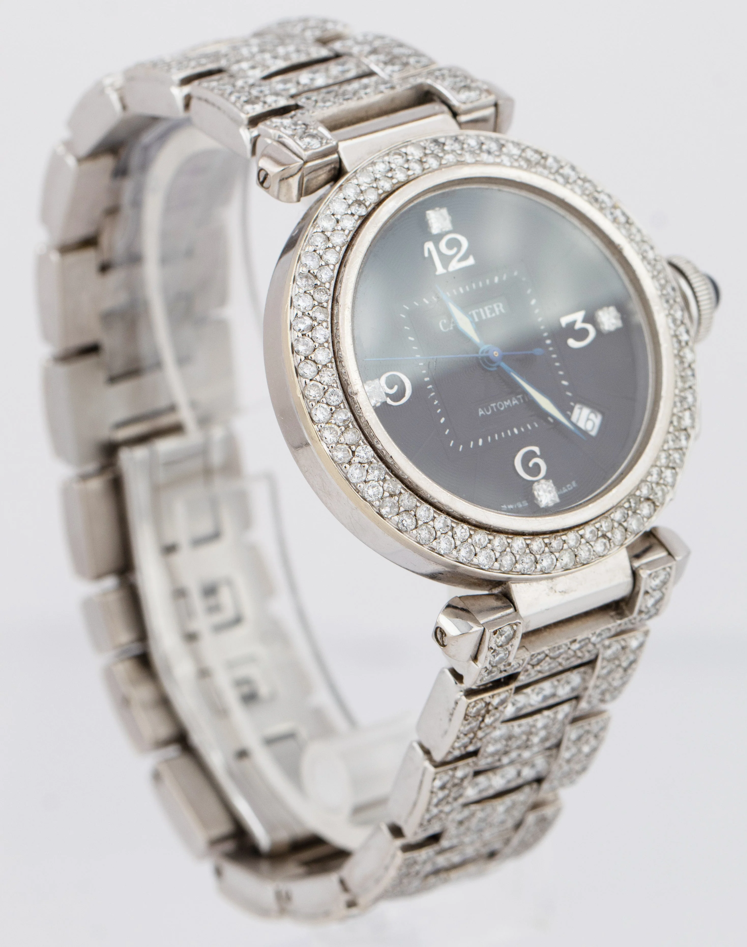 Cartier Pasha Black 38mm DIAMOND 18K White Gold Steel Automatic Date Watch 2353