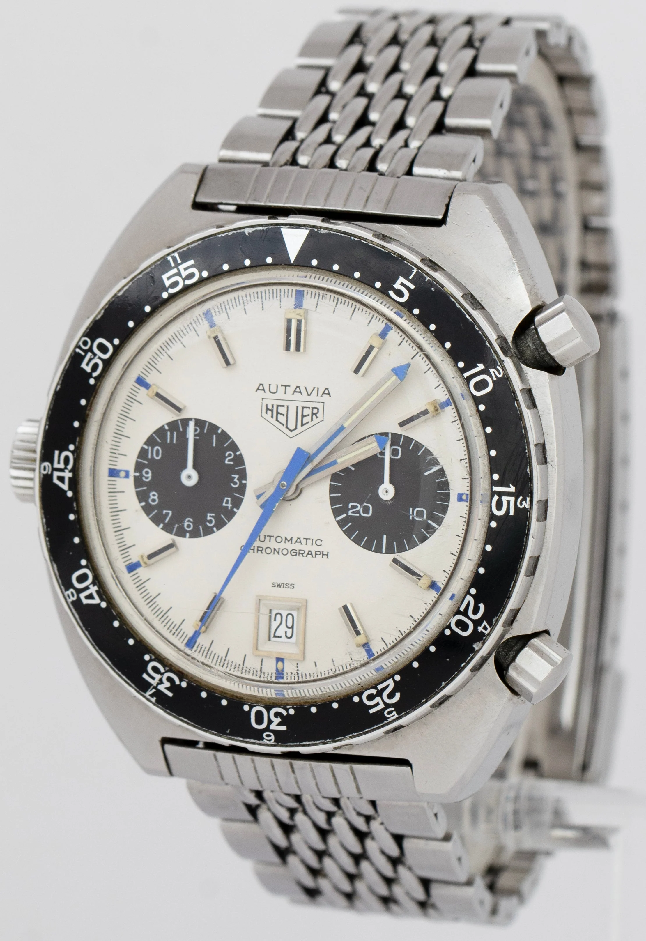 RARE 1971 Vintage Heuer Autavia Jo Siffert White Chronograph 42mm Steel 1163 B+P